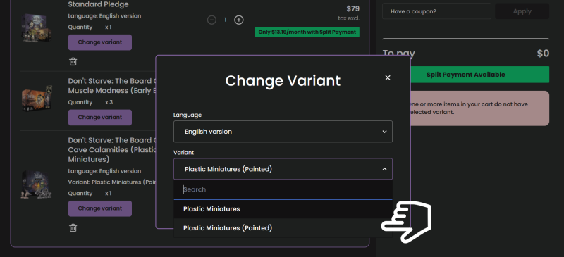 - Once you are in your cart, make sure to click "Change variant" (everywhere where it's applicable) and select a language option or specific variant for the product.