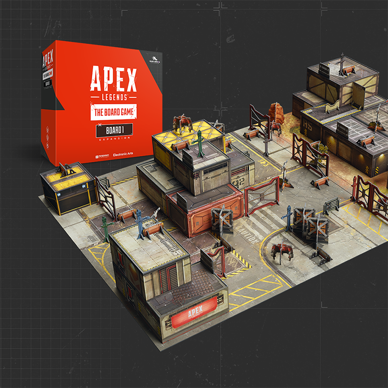 The Board 1 Expansion adds new Map tiles for use in Apex Legends™: The Board Game, based on the industrial themes of Kings Canyon and offering new buildings and terrain features, including fences, which function as impassable obstacles. The new board can be attached to the default one using a set of connector tiles, which enlarges the potential battlefield.
