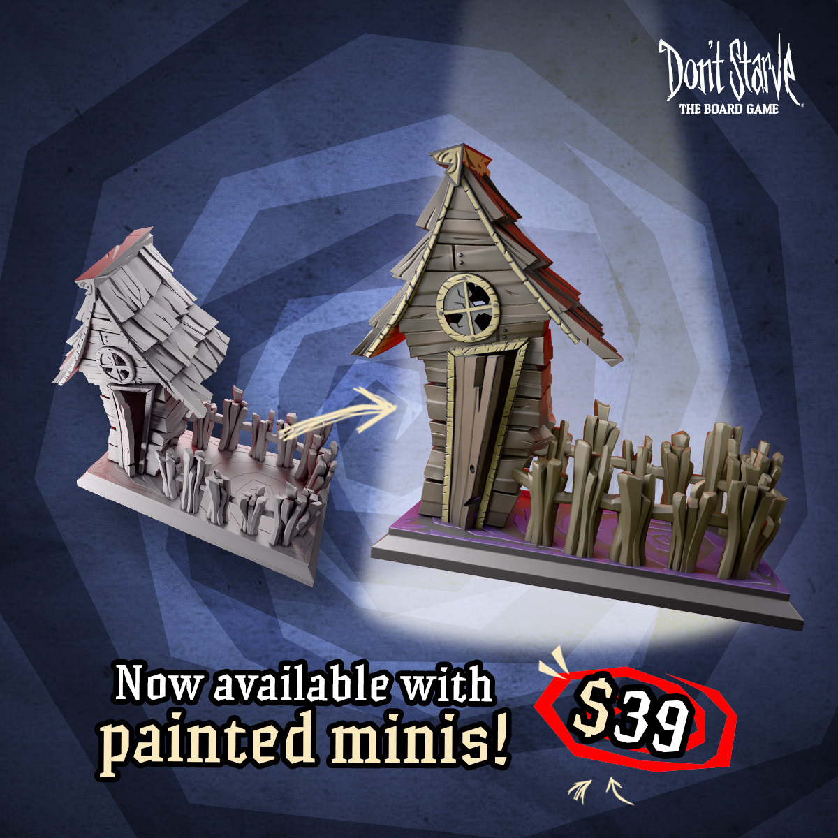 Roll in style with the Don't Starve: The Board Game dice tower, modeled after the Ruined House from the video game. Its detachable roof makes it useful both as a dice-rolling contraption and as a display piece for Don't Starve fans.