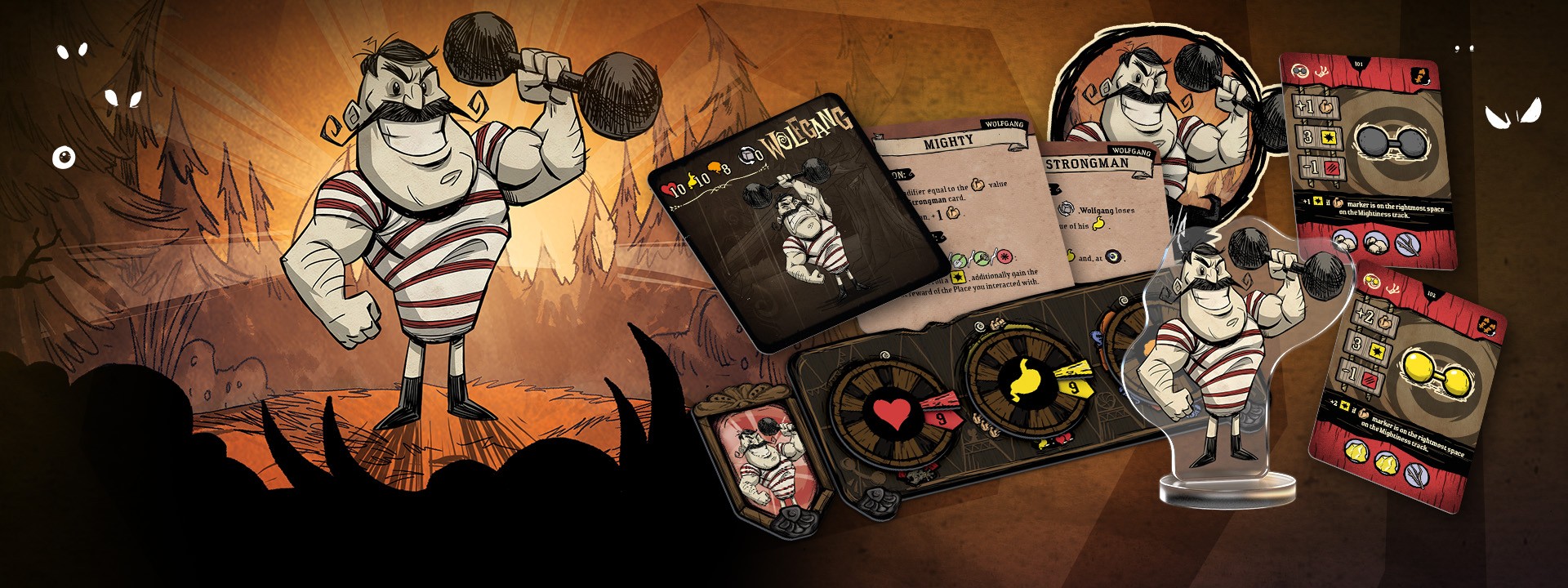 A character expansion that adds one new playable character—Wolfgang—along with all of his game components, as well as a delightfully chunky painted vinyl miniature and a digital skin for use in Don't Starve Together.
