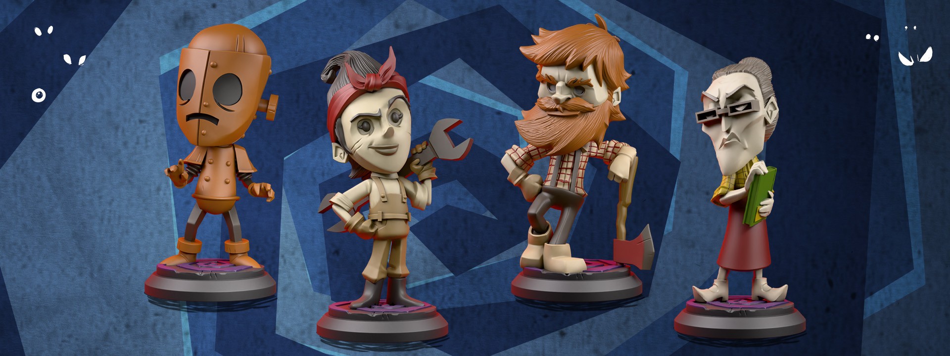 This set includes fully painted, extra-large vinyl miniatures of Wickerbottom, Woodie, WX-78, and Winona.